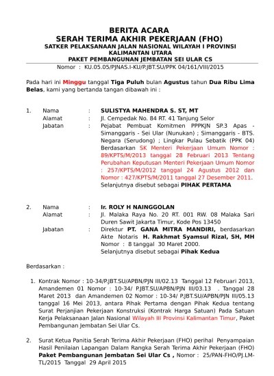 Berita acara serah terima pertama pekerjaan pho noomor. Berita acara serah terima hasil pekerjaan. Adapun pada saat proses penyerahan akhir hasil pekerjaan ini kelengkapan dokumen yang . Dengan spesifikasi pekerjaan sebagai berikut: Contoh berita acara pho proses ba pemeriksaan pek.